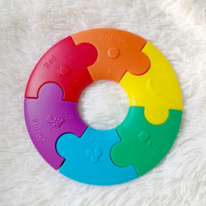 Colour me pretty! A wonderful first puzzle toy for a teething bub that stimulates those senses with a textured underside of each piece. Interlock in any combination to create a full circle.