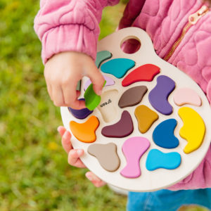 The Artist Palette Puzzle consists of a palette shaped base and paint colour shaped pieces. The names of each colour are also printed in the corresponding place on the base of the puzzle.