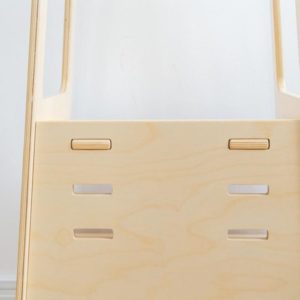 What makes AVDAR LEARNING TOWER special is that it has trapezoid shape, which adds more stability to the tower during it is being used. On 2 side panels we cut 2 openings, it helped to reduce some weight and created 2 possibility of handles while child climb onto the tower. There are 3 levels that can be adjusted depending on child’s height.