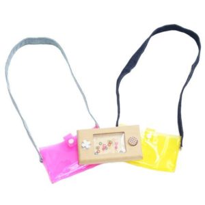 Press the buttons and try all the rings onto the poles – it can be done! Comes with a yellow pouch and detachable denim straps